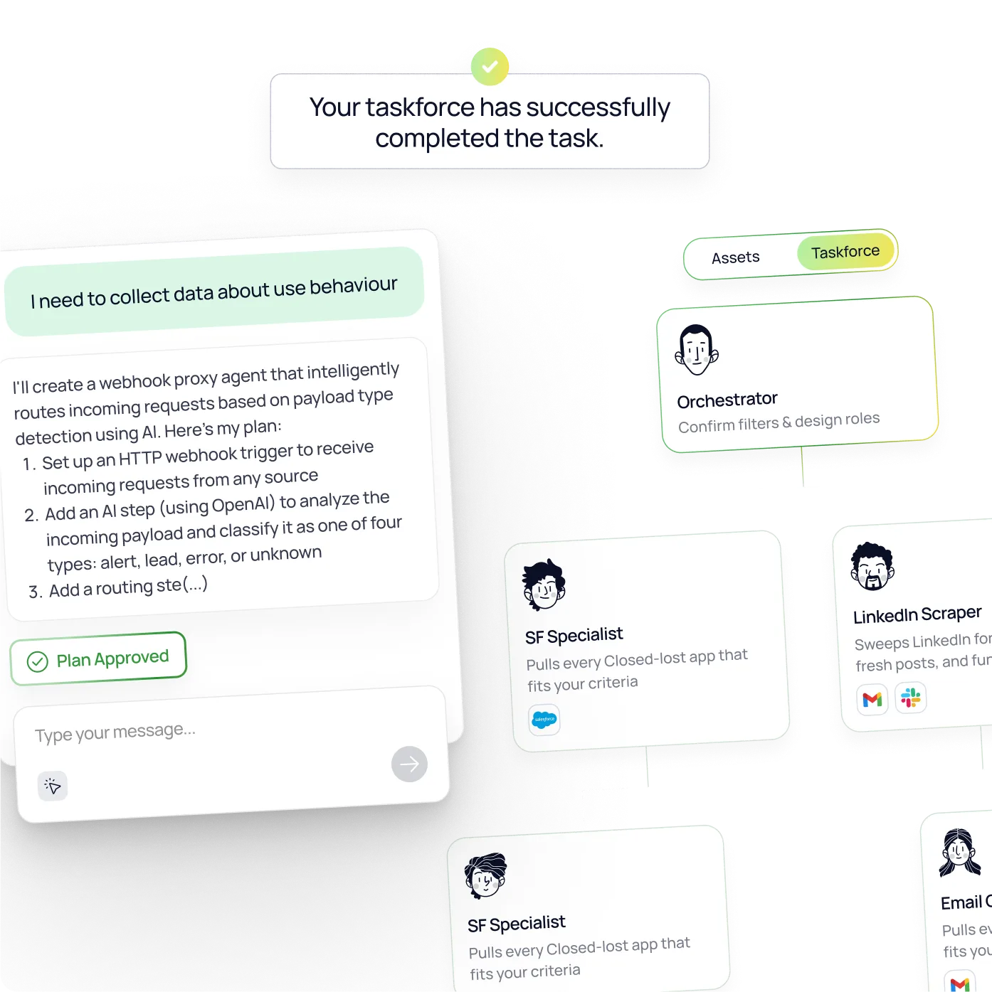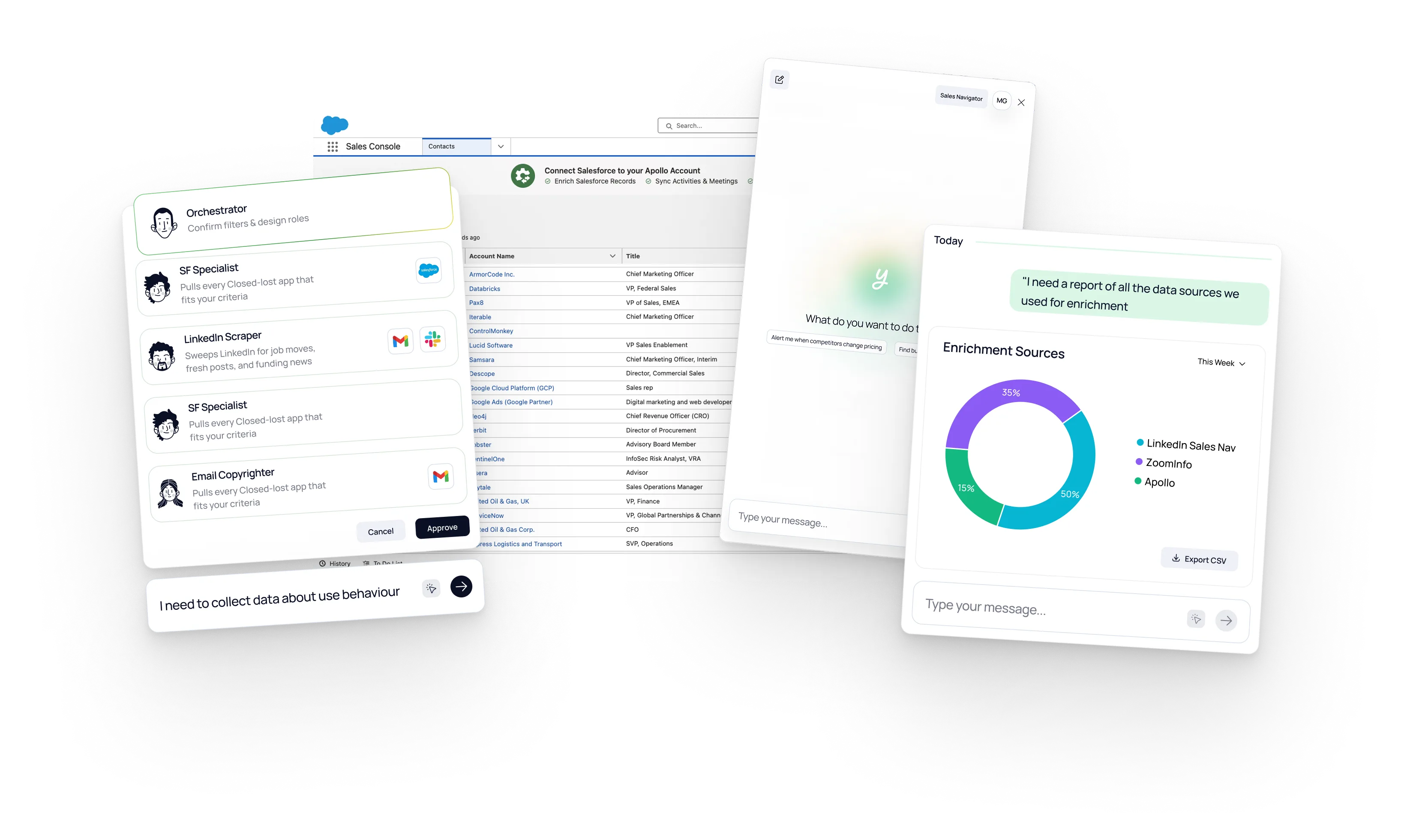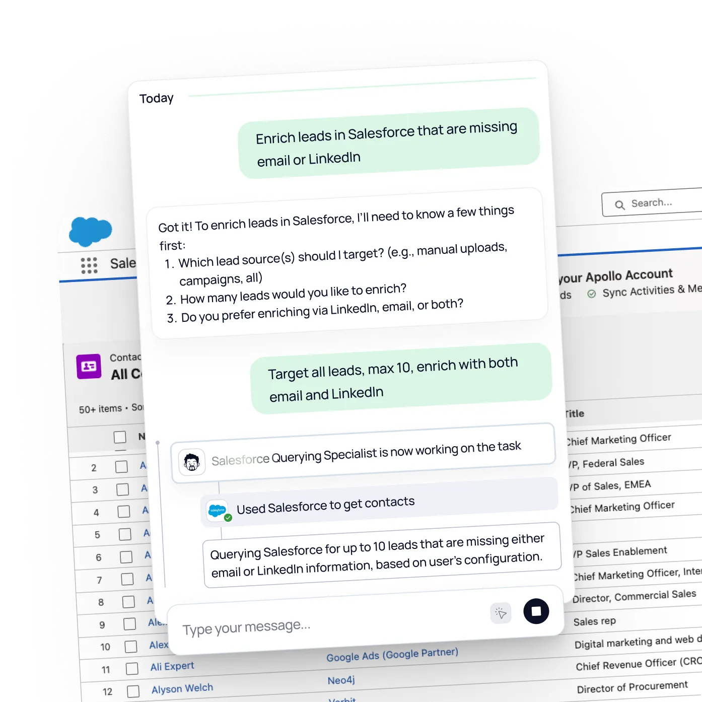 Native integration with Salesforce and Slack. Your Agentic AE monitors deals in Salesforce, surfaces actions in Slack for approval, executes automatically, and logs everything back to Salesforce. Works where you already work.